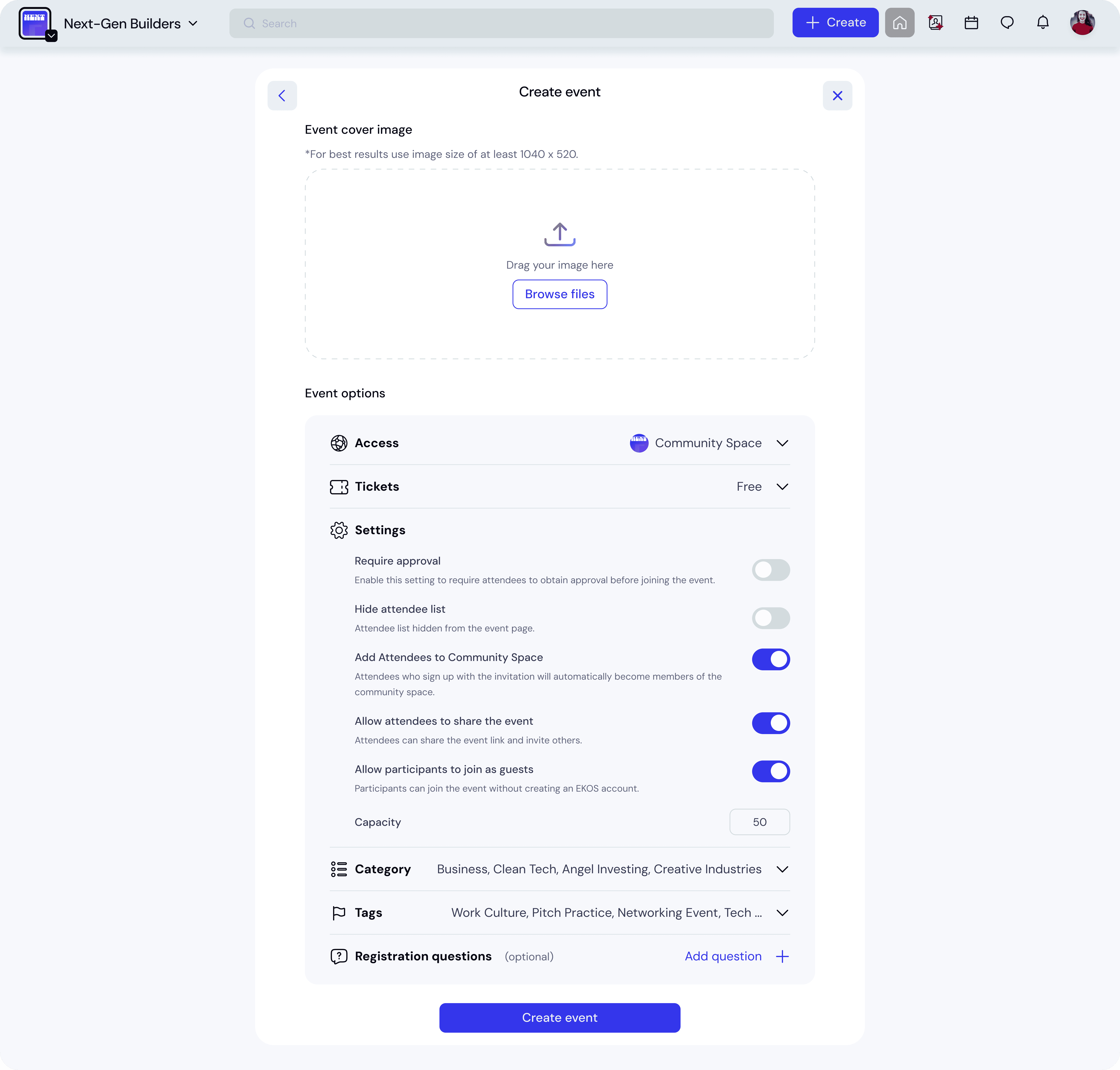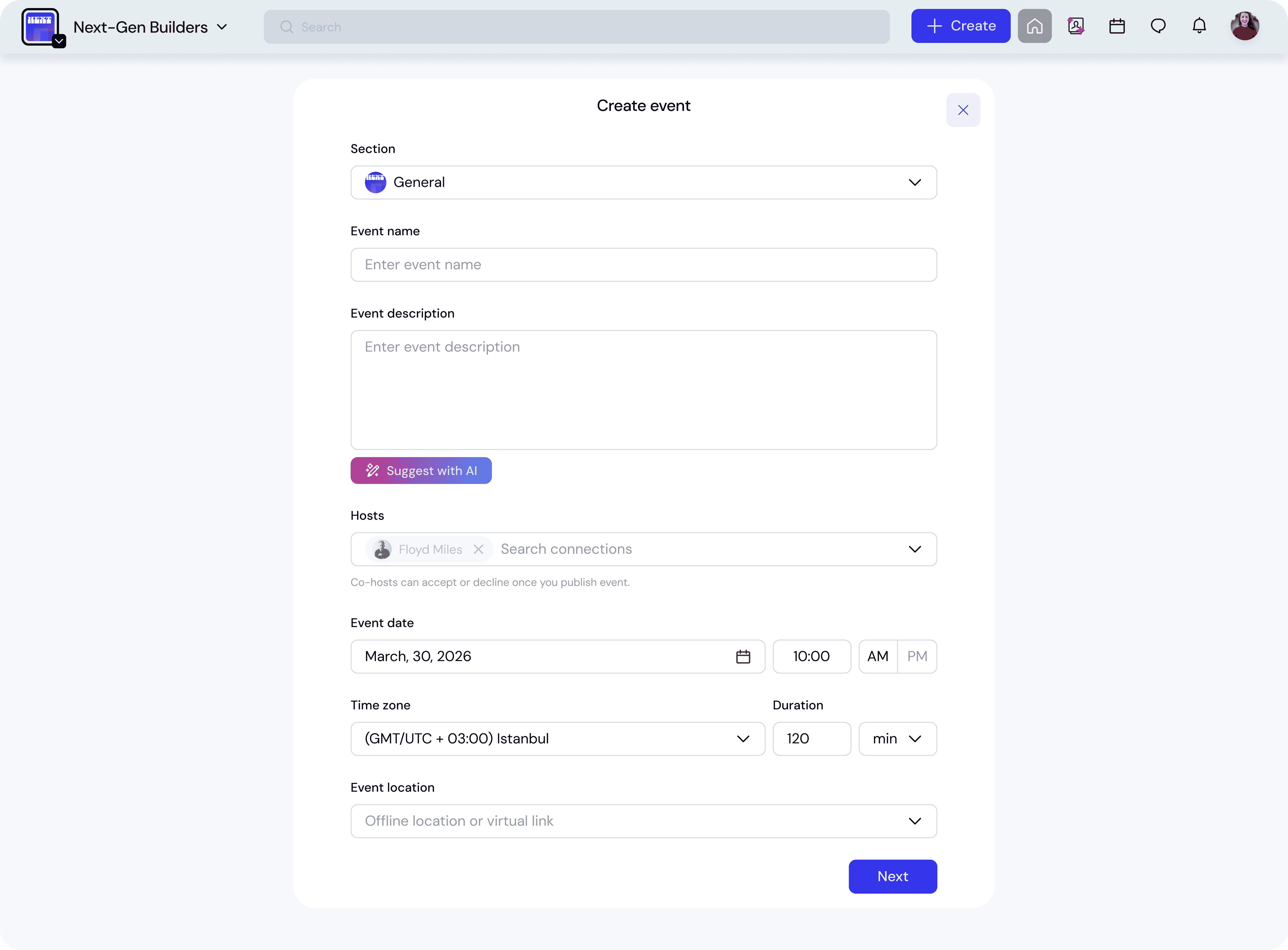 Events allow you to host meetups, webinars, workshops, or community gatherings directly inside your space.