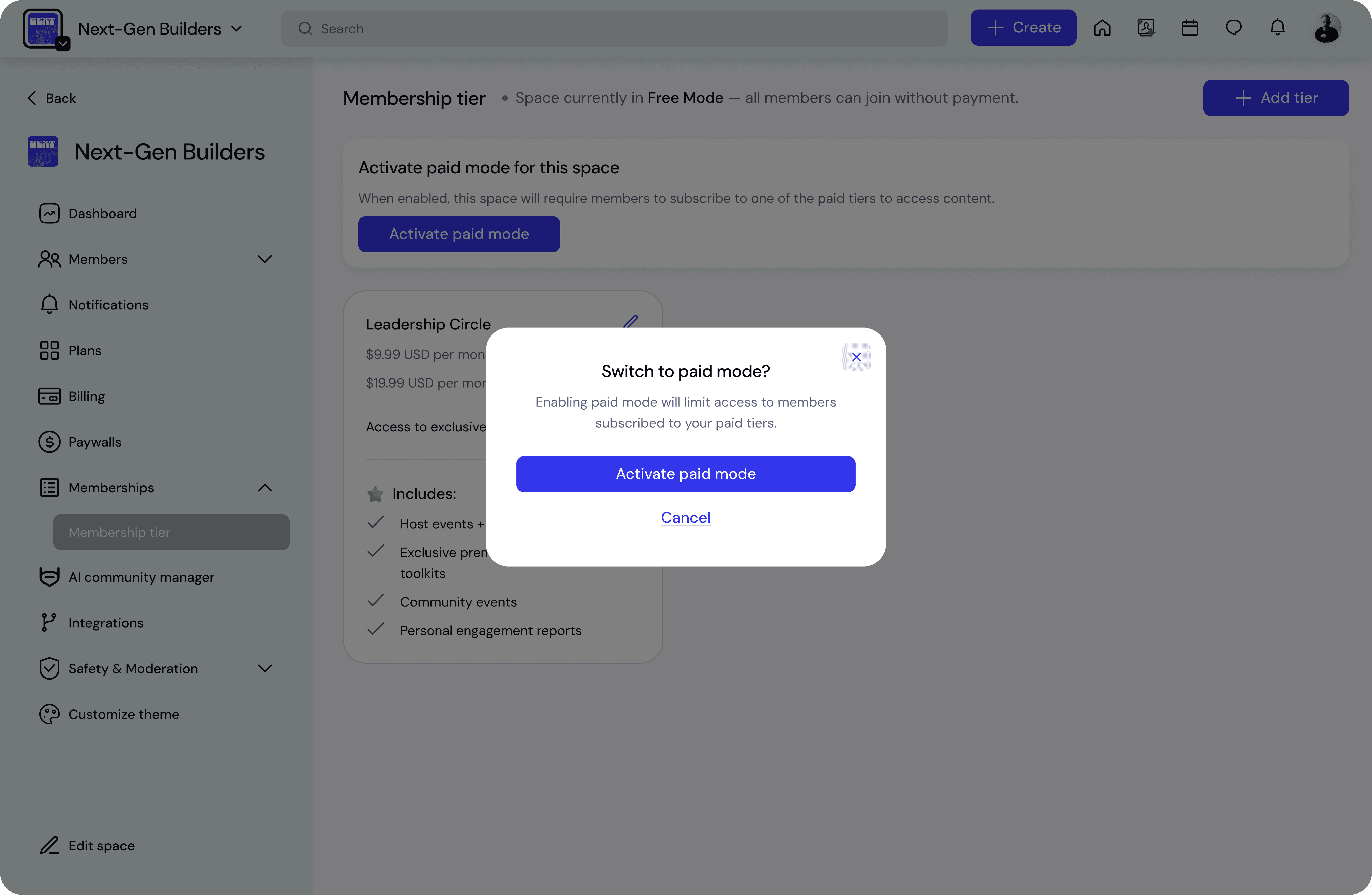 If you want the space to require a subscription, you can activate Paid Mode.
