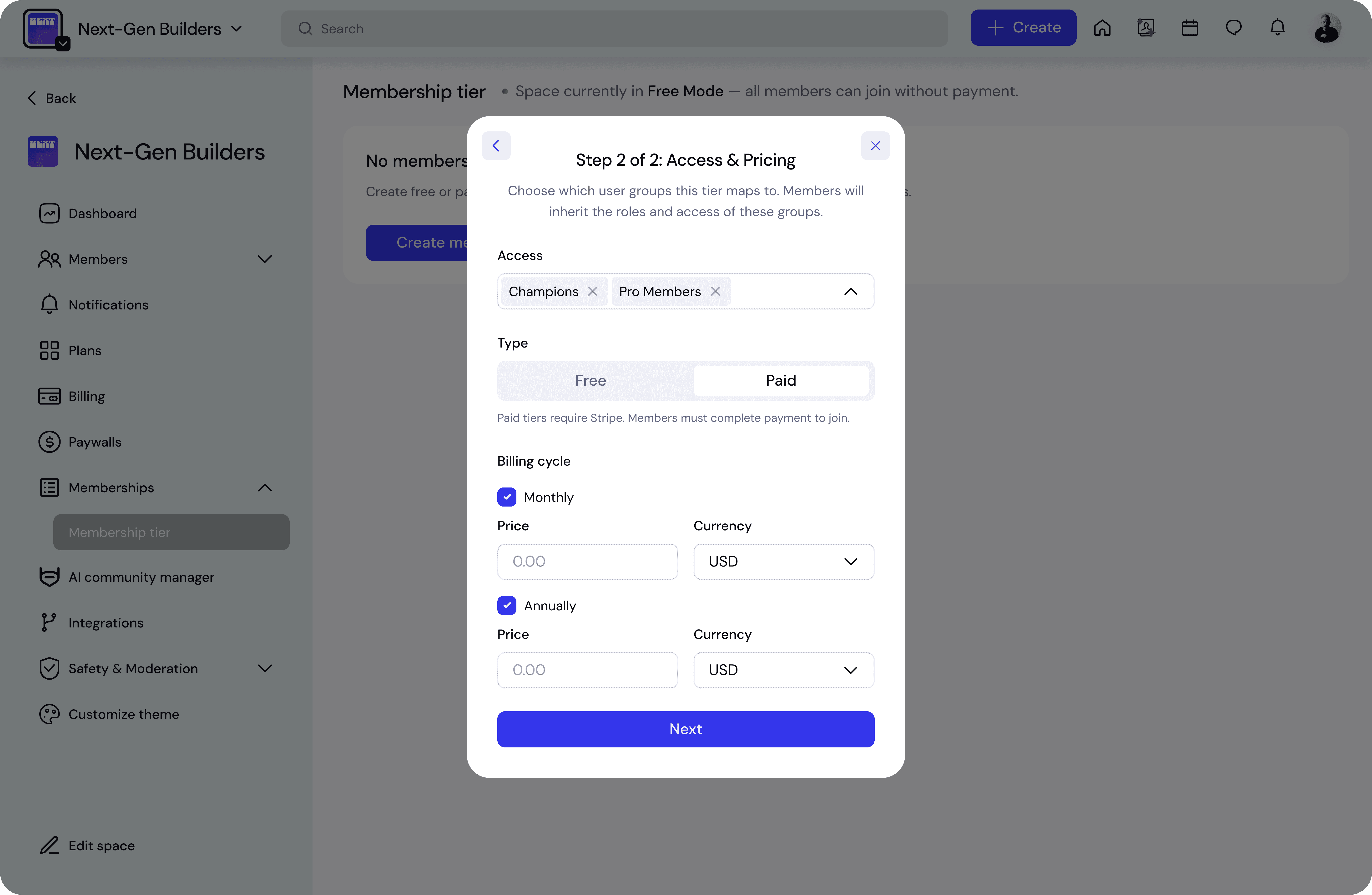 Choose whether the tier is Free or Paid.